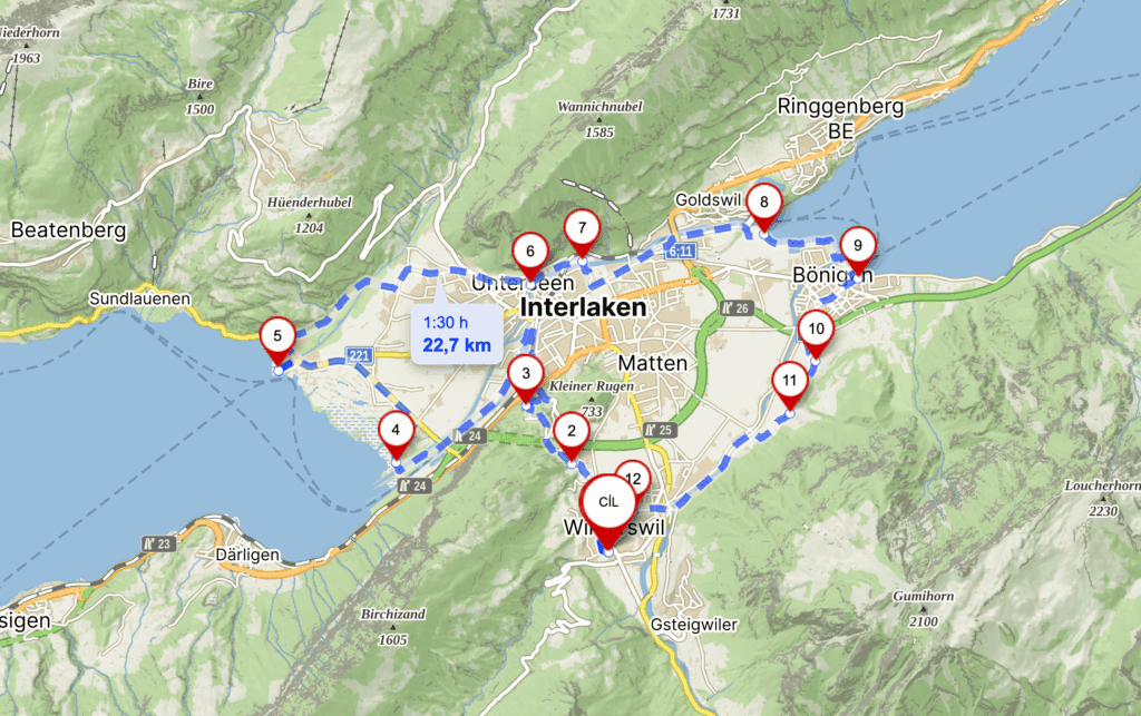 The Interlaken E-bike Tour continues along peaceful lanes by the golf course to the shores of Lake Thun, before forest paths and farmland trails bring us to Unterseen – a historic town with cobblestone alleys and traditional houses. Crossing the Aare River, we pass the casino park and fountain on our way to Interlaken Ost. From here, the route follows the sparkling Lake Brienz shoreline into Bönigen, where the turquoise lake shows its most stunning views.